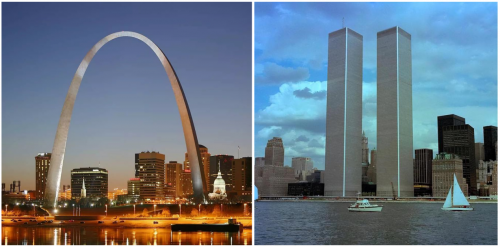 1965年建成的圣路易斯不锈钢大拱门(左),至今仍然是西半球最高的人造纪念碑。而1973年竣工的世贸中心(右),则是钢框架套筒结构。这都是美国钢铁落日余晖下的地标。