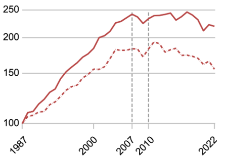 包括钢铁行业在内的美国制造业劳动生产率变化(实线为龙头企业,虚线为其他企业),由此可见,特朗普的保护主义根本没有阻止生产效率的下滑。图表来源:纽约联储