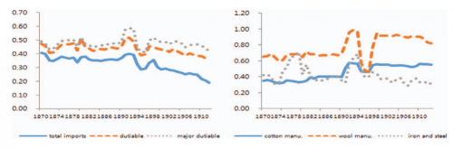 1870-1913年美国制造业平均关税税率(左)和几种主要产品的关税税率(右),其中钢铁关税是下降较快的。Yeo Joon Yoon:Tariffs and industrialization in late nineteenth century America: the role of scale economies,2020-5。