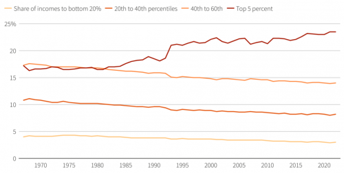 美国不同层级的收入占比情况。半个世纪以来,只有最富有的5%人群,其收入占比还在不断上升。图片来源:路透社
