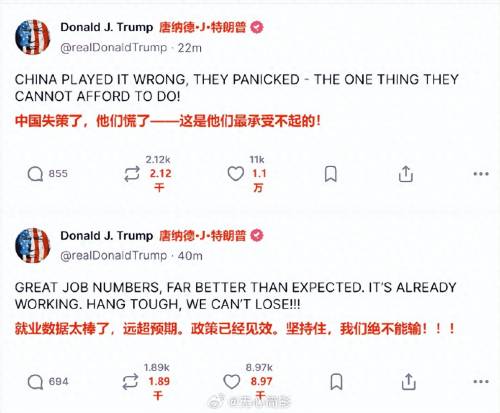 特朗普在社交媒体上写道:中国下错了棋并陷入恐慌,报复关税是中国绝对承受不起的一个错误。