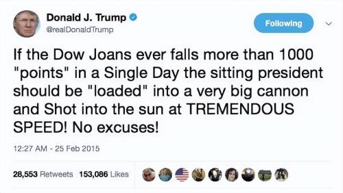他那时是这么说的:如果有一天,道琼斯指数单日下跌超过1000点,那么美国现任总统就应该被装进大炮,以极快的速度射向太阳,不允许有任何借口。