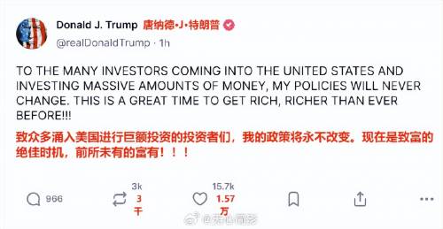 他在社交媒体上说:对于许多来到美国并投入大量资金的投资者,我的政策永远不会改变。现在是致富的大好时机,比以往任何时候都更富有!!!