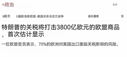 紧接着,美国《政治报》指出,一名欧盟官员称,欧洲对美国70%的出口面临被关税影响的风险。初步估算显示,川普的关税将冲击价值3800亿欧元的欧盟商品,这可能或令冯德莱恩的8000亿欧元武装欧洲计划彻底泡汤