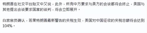 白宫官员表示,如果按照特朗普的警告,美国对中国关税将高达104%!