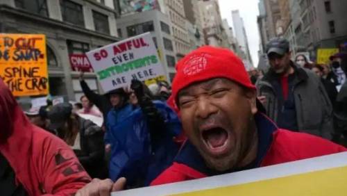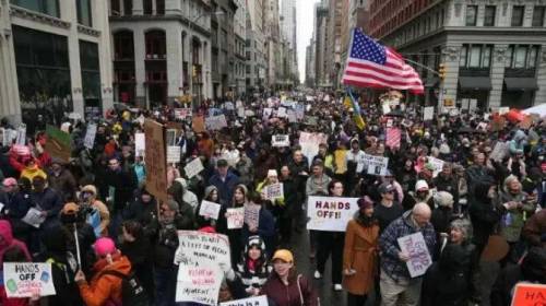 愤怒的美国民众高呼“停手,不要胡来”的口号,抗议特朗普、马斯克进行的全面加征关税、大规模裁员等改革。