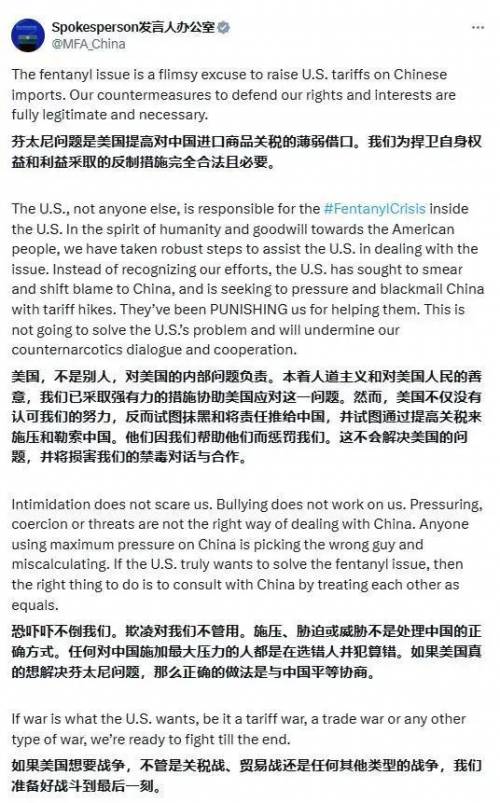 中方的态度与以往截然不同,这次是坚决反击,外交部更是发言称,中方不惧怕任何形式的战争,包括关税战、贸易战和热战争等等。