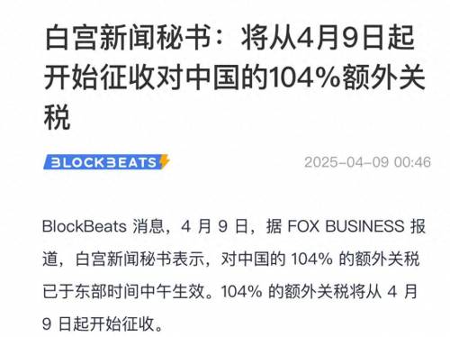 就在今天凌晨,美国白宫传来了一个重磅消息:从4月9日开始,美国将对中国商品征收高达104%的税率,这个消息已经得到了白宫方面的确定。