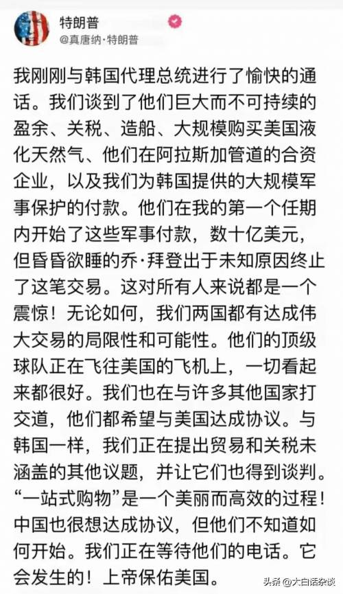 此外,特朗普还在社交平台上炫耀,称韩国代理总统已经与他进行了通话,在能源上达成了大规模购买协议,在他任期内已从韩国收到了数十亿美元的军事保护费。
