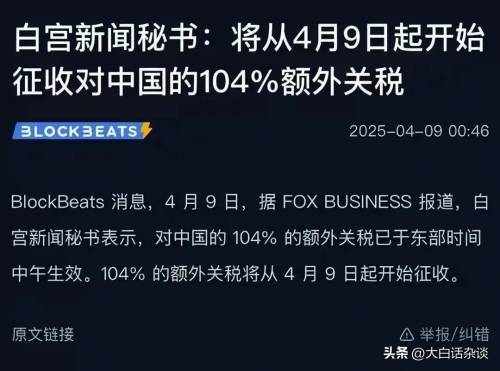 一觉醒来已是凌晨5点,打开手机瞄了一眼,看到美国已经于凌晨2点对中国商品加征104%关税的消息映入眼帘。