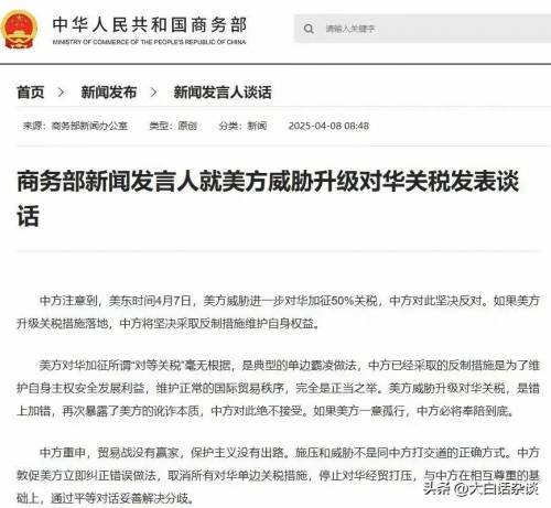 在4月8日,中国商务部就强硬发声,如果美国升级关税继续落地,中国将坚决发起反制措施以维护自身权益。
