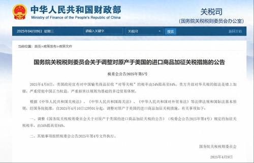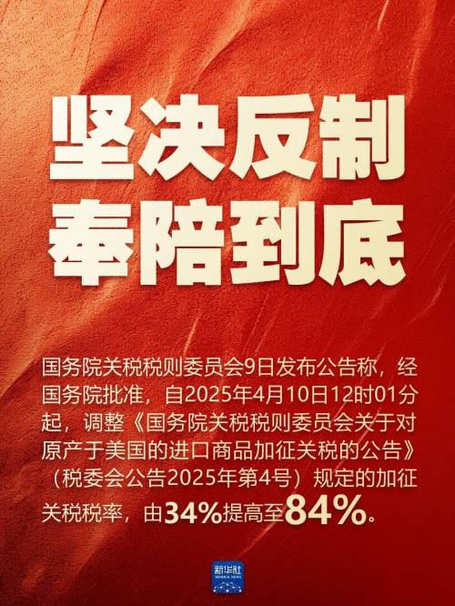 人民日报消息,经国务院批准,自2025年4月10日12时01分起,调整对原产于美国的进口商品加征关税措施,税率由34%提高到84%,即提高了50%。