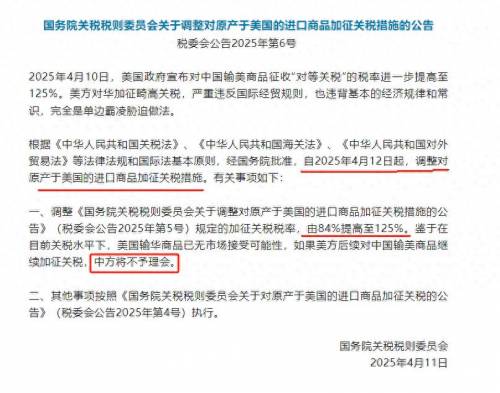 新华社4月11日消息,国务院关税税则委员会发布通告,中方按照对等原则将对美关税由84%提升至125%。