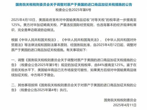 据新华社4月11日消息,对于特朗普10日宣布,将对华关税加至125%之事,国务院关税税则委员会公布了中方的新一轮反击措施。事实证明,中方“奉陪到底”的警告并非空话,宣布将对美国商品的关税提高到对等的125%,继续坚决反击美方的关税霸凌。