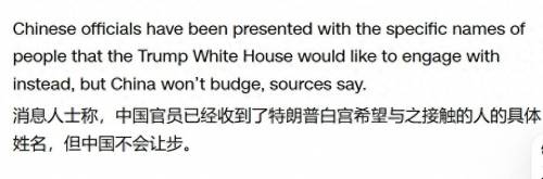 10日美国有线电视新闻网(CNN)继续报道了中美在关税问题上的僵局,其中提到一句话:“消息人士称,中国官员已经收到了白宫希望接触的人员名单,但中方不会让步”。