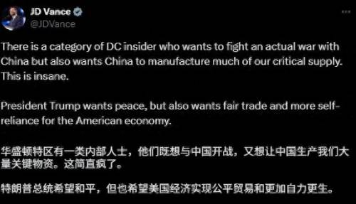 万斯表示,不管关税战结果如何,最重要的就是保证美国不需要跟中国开战,只要不开战,双方就还有回旋的余地。