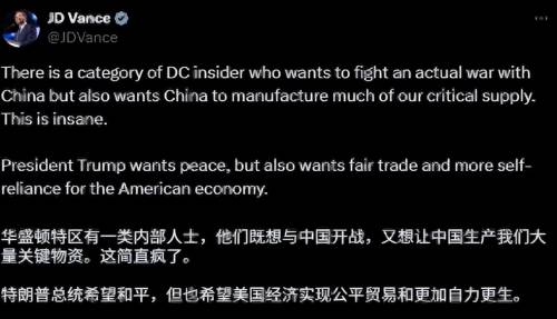 眼看特朗普的说辞微乎其微,副总统万斯也急忙为他辩护,痛批:华盛顿有一群“内部人士”一直在鼓动对华开战,甚至还想让中国为美国生产军火,都是特朗普力排众议,才压制住事态,没有让进一步恶化。