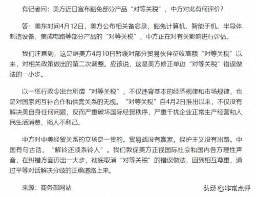 特朗普宣布对部分关税豁免的事,传遍了全球,他目前的最新政策是:对智能手机、计算机等多个电子产品,进行了“对等关税”豁免。针对此事,中国商务部官方也于4月13日做出了回应。咱们在回应中没有松口,没提会对美国降关税,而是给他指了条明路。