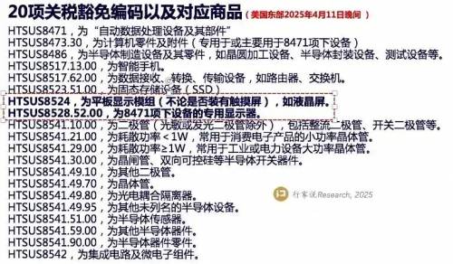 即在美国东部4月11日晚间,美国海关与边境保护局(CBp)宣布,根据当日特朗普总统签署的备忘录,对部分商品(特定品目及子目下产品)不征收此前第14257号行政令下的“对等关税” ,其中涵盖平面显示模组、专用显示器。这也就意味着,对原产于中国的以下商品不再征收125%的“对等关税”。