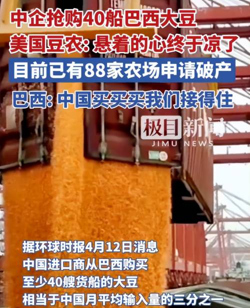 当前巴西已经取代美国成为中国第一大大豆供给国,有了金砖联盟的加成,中国与巴西的贸易额屡创新高,现在巴西、阿根廷等南美农业大国都在趁着中美博弈期间去抢占中国市场份额,倘若美国执迷不悟,那么也必将丧失全球农业产业链的主导权。