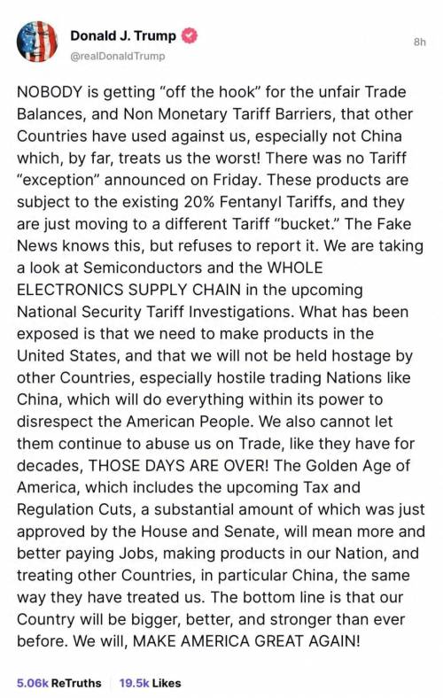 然而仔细看,特朗普这个帖子其实什么新内容也没有,在他之前,商务部长卢特尼克周日已经表示对半导体等电子产品免除关税“是暂时的”,一两个月后将会出台半导体行业关税。特朗普指责中国“对待我们(美国)的方式是最糟糕的”,表示20%的芬太尼关税将转移到其他的“关税桶”中,这一转移卢特尼克也已经说了。对于市场最关心的美国是否已经免除了中国电子产品125%的“对等关税”,以及如果现在免除了,半导体行业关税出台时会不会又加回来,特朗普回避了,之前卢特尼克也没有说清楚。