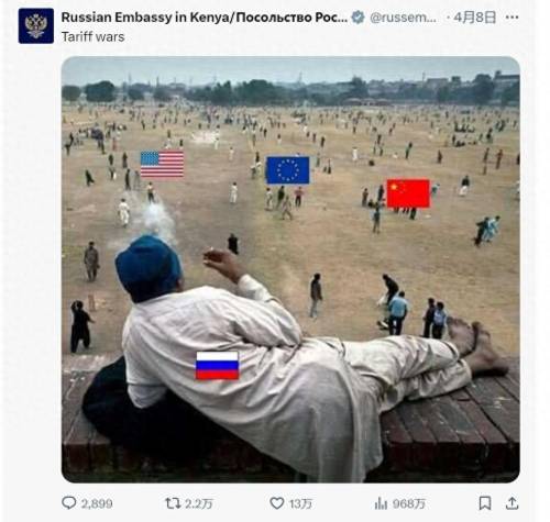 在中美关税战正式打响之后,俄罗斯的心态就颇为微妙,俄驻外大使馆甚至发图调侃自己“坐山观虎斗”,冷眼旁观中美的激烈对抗。然而,事实表明俄罗斯很可能“玩砸了”,沦为了关税战的最大输家。