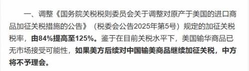 在此之前,特朗普政府宣称将针对中国所征收关税的税率提升至125%。