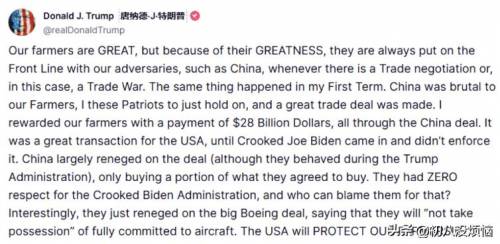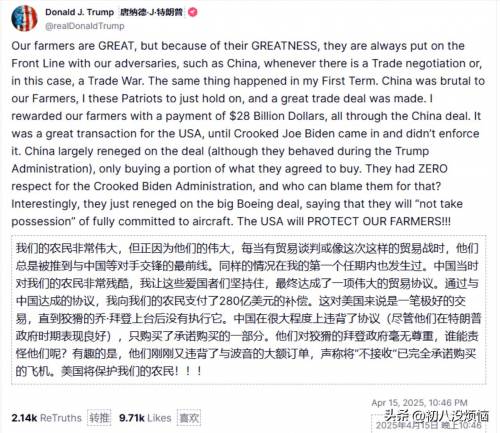 4月15日,美国总统特朗普在社交媒体上连发两条“咆哮体”动态,矛头直指中国。一条指责中国“对农民太狠”,另一条则控诉中国“撕毁与波音的大单”。