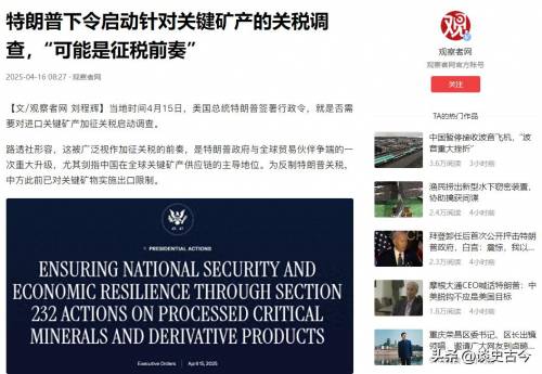 据观察者网报道,当地时间4月15日,特朗普签署行政令,启动针对钴、镍、稀土等关键矿产的国家安全调查,剑指中国在全球供应链的主导地位,并打算与中国来一次巅峰对决。