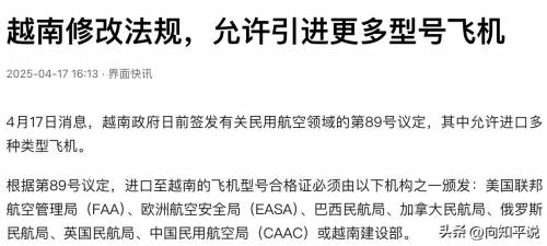 而且就在4月17日,越南终于通过了民用航空第89号议案,议案中规定越南引进的外国民用飞机具体型号,必须符合美国、欧洲、巴西、加拿大、俄罗斯、英国和中国等国家地区民航局或者航空局颁发的型号合格证标准。