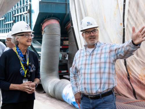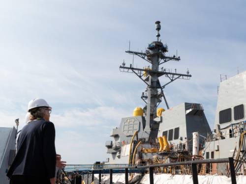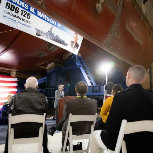 ?美国巴斯钢铁造船厂近日接待了珍妮特·威尔逊·泰勒——未来"小路易斯·H·威尔逊号"驱逐舰(DDG 126)的赞助人之一,也是该舰命名者的女儿。泰勒参观了目前正在干船坞中的军舰,并与建造该舰的工人们会面。