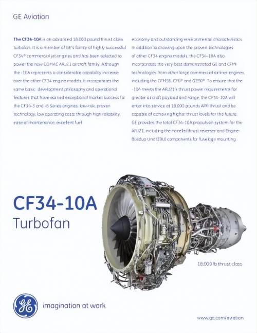 从飞机的航空发动机需求上,C909型客机采用的发动机是美国通用电气(GE)研制的CF-34-10A型小推力涡轮风扇发动机,具备体积较小,总体设计可靠,燃油经济性好的特点。在实际使用过程中,签派可靠率在99.6%左右。