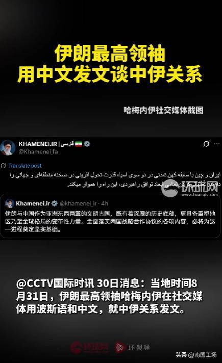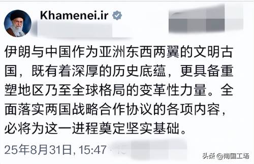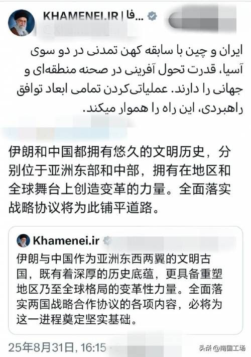 2025年8月31日,伊朗最高领袖哈梅内伊在社交媒体用波斯语和中文,就中伊关系发文,还是连续发出了三条中文消息。伊朗最高领袖哈梅内伊表示:“伊朗与中国作为亚洲东西两翼的文明古国,既有着深厚的历史底蕴,更具备重塑地区乃至全球格局的变革性力量。全面落实两国战略合作协议的各项内容,必将为这一进程奠定坚实基础。”,“伊朗和中国是亚洲两大文明古国,拥有引领地区乃至世界变革的力量。全面落实战略伙伴关系协议的各项内容将有助于为此铺平道路”。“伊朗和中国都拥有悠久的文明历史,分别位于亚洲东部和中部,拥有在地区和全球舞台上创造变革的力量。全面落实战略协议将为此铺平道路。”在8月31日,伊朗总统佩泽希齐扬抵达中国天津,参加上合峰会,他是当选伊朗总统后首次访华。