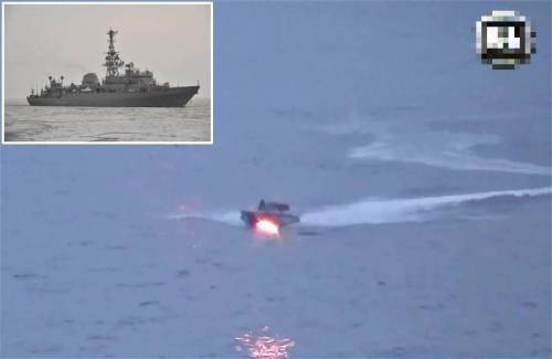 (乌克兰无人艇对俄罗斯战舰发起突袭的场景)