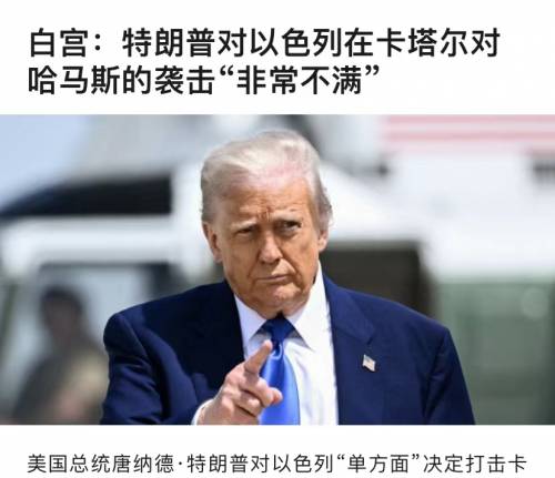 白宫发言人声称,特朗普对以色列“单方面”决定打击卡塔尔的哈马斯领导层感到“非常沮丧”。据她称,特朗普表示卡塔尔是美国的坚定盟友和朋友,所以对以色列越境打击“非常不满”。