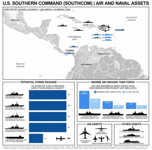 从8月下旬开始,美国就在委内瑞拉附近海域集结了至少8艘大型舰艇,包括“硫磺岛” 号两栖攻击舰、2艘两栖船坞运输舰, 1艘"提康德罗加"级巡洋舰、3艘"伯克"级驱逐舰和1艘医院船,水下很可能还有1艘核潜艇。