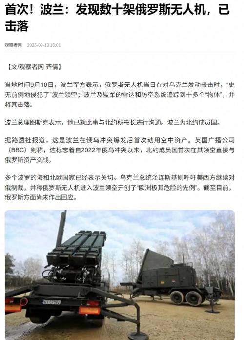 当地时间9月10日,波兰军方表示,俄罗斯无人机在对乌克兰发动袭击时,“史无前例地侵犯了”波兰领空;波兰及盟军的雷达和防空系统,追踪到十多个无人机,并将其击落。
