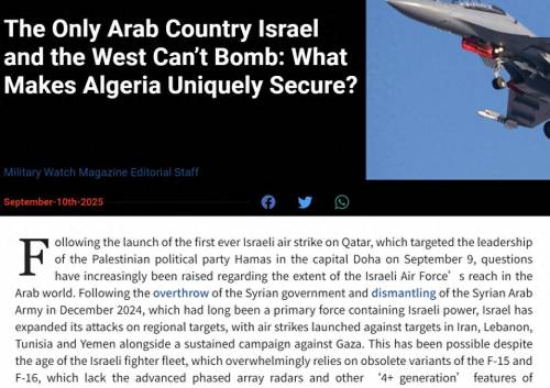 在不惜口碑的保证,以及意外事件的冲击下,美国允许以色列空袭卡塔尔这事,在表面上算是糊弄过去了,参与的几方现在都不想再提。但在海湾国家纸糊的“花钱买平安”战略被戳穿后,美国“Military Watch”网站给出了一个很有趣的观点——“北非的阿尔及利亚,是以色列唯一不敢轰炸的阿拉伯国家”。