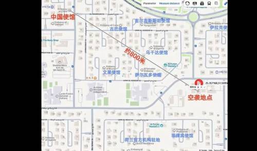 值得我们关注的是,根据英国媒体公布的卫星图片可以看出,导弹砸下的地方,周围一公里内分布着各国的大使馆,也包括中国,直线距离仅有800米。