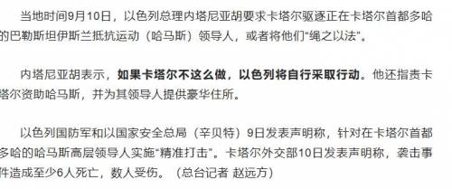 然而,以色列不仅没有向卡塔尔给出任何交代,反而勒令其将在多哈的哈马斯领导人驱逐,或者将他们绳之以法,并威胁如果不这么做,以色列将自行采取行动。