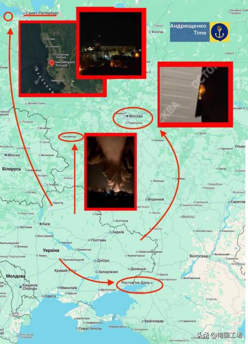 俄罗斯列宁格勒州州长德罗兹登科表示,无人机袭击了俄罗斯最大的石油港口,普里莫尔斯克港口被命中,其中一艘船只起火,港口的灭火系统已启动,火势被控制。位于俄罗斯斯摩棱斯克的卢克石油公司油库,以及卢甘斯克地区的一个俄军无人机仓库,遭到猛烈袭击。莫斯科附近和罗斯托夫地区也发生了爆炸。俄罗斯首都市长索比亚宁报告称,当晚有九架乌克兰军队发射的自杀式无人机、巡航导弹,在接近莫斯科时被击落。