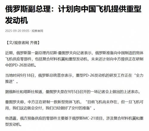 就在导弹落地的同时,一场技术合作也悄然落地。俄罗斯副总理曼图罗夫在同一天正式宣布,俄罗斯将向中国交付“世界最先进”的航空发动机。