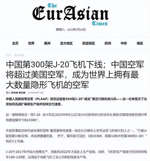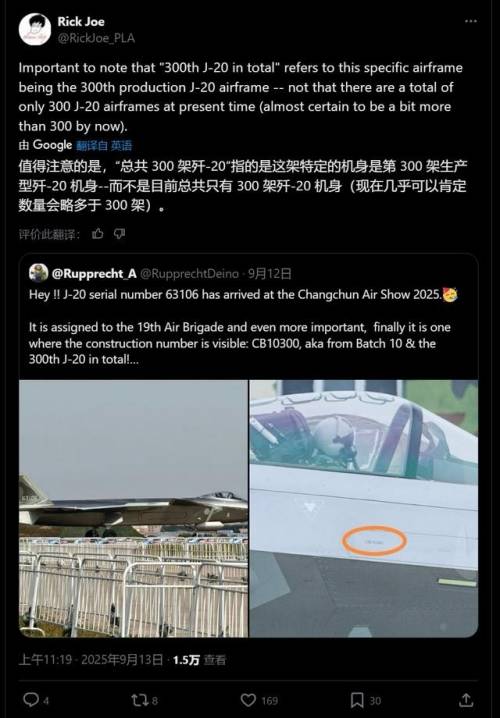 转到9月,长春航展这事儿把拦截的热度又拉上去了。9月12到14日,航展在吉林长春拉开帷幕,歼-20静态展出,编号63106的家伙格外抢眼。社交媒体上,中国军事粉丝先扒出驾驶舱边上的低可视编号CB10300,这意味着是第10批次,第300架歼-20。航空主义者网站9月17日报道,解放军空军至少装备了300架歼-20,从2024年6月起又交付50架。欧亚时报3天前发文,直说中国歼-20滚出第300架,pLA空军会不会超美军成全球最大隐身机队。报道引用五角大楼去年12月的评估,中国实际数量可能超400架。长春现场,四架歼-20到场,序列号63005、63101、63201和63106,全归19航空旅,驻张家口宁远机场。这批机子工艺精细,表面处理像工艺品,进气道和鸭翼对得严丝合缝。
