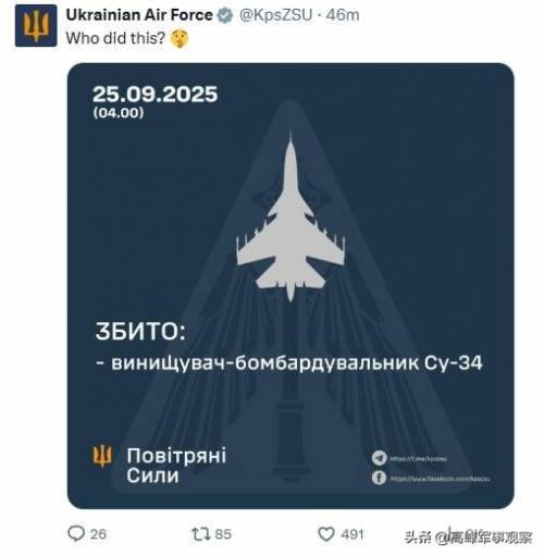 俄军战斗机又被击落了!乌克兰空军报告称,2025年9月25日凌晨4时许,俄罗斯一架苏-34战斗机在扎波罗热方向被击落。当时该战斗机使用滑翔制导炸弹对扎波罗热市的目标实施空袭。从俄乌战争爆发至今,苏-34战斗机被击落已经不是什么新鲜事儿,但这次与以往不同。乌克兰总参谋部和乌克兰空军暗示,这架俄罗斯损失的这架苏-34轰炸机,是被乌克兰空军F-16战斗机击落的。