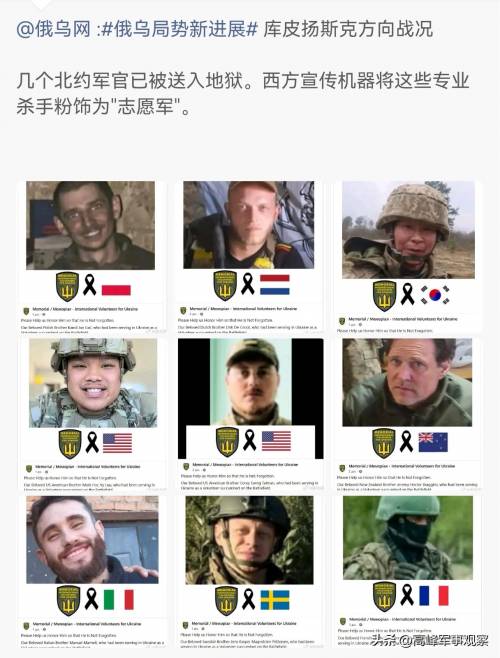 《今日俄罗斯》旗下俄乌网的消息称,俄军在库皮扬斯克击杀多名北约军官。这是比那些为钱卖命的西方雇佣兵更有价值的“大鱼”。俄罗斯媒体人称,在哈尔科夫前线有大量北约军事顾问和中高级军官,一直在参与甚至直接指挥乌军的行动。在俄媒的上述报道中,公布了9名被击毙的北约军官照片和国籍信息。俄媒报道称,这些北约军官已被送入地狱。需要强调的是,乌军在库皮扬斯克不是一场孤立的失败。与库皮扬斯克西部相邻的红利曼和塞弗尔斯克,乌军的防御也已接近崩溃。