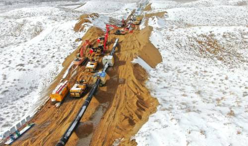 图 | 中国石化石油工程建设公司江苏油建分公司建设者在风雪中进行天然气管道连接施工作业