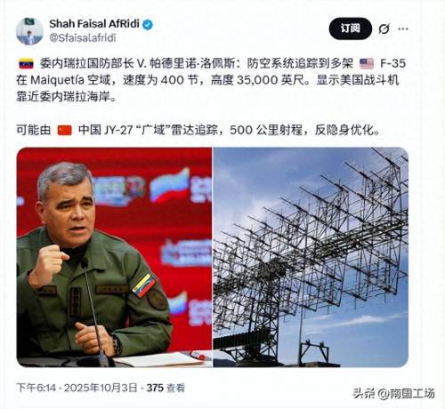 就在中国歼-16重型战斗机压制美军F-22隐身战斗机的消息曝光后,委内瑞拉方面也传出,成功利用中国制造的反隐身雷达,锁定美军F-35隐身战斗机的报道。当地时间2025年10月4日,委内瑞拉国防部长洛佩斯表示,委内瑞拉雷达防空系统已发现了美军F-35隐身战机,洛佩斯表示:“我们(委内瑞拉)的雷达防空系统,在迈克蒂亚飞行情报区内,发现超过五架美军F-35隐身战机”,“委内瑞拉雷达监控后发现,美军F-35战斗机的飞行速度达400节,高度达35000英尺”。
