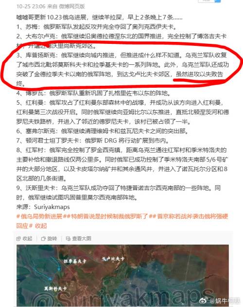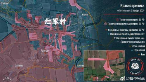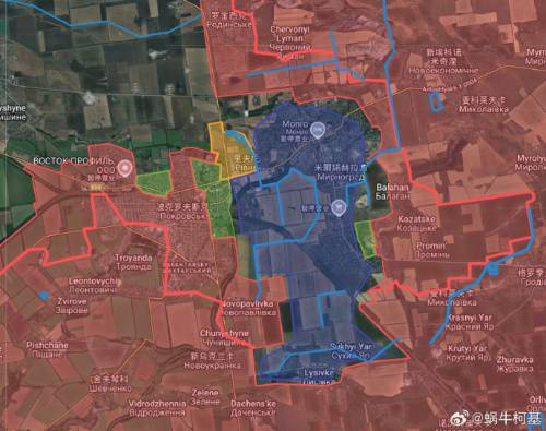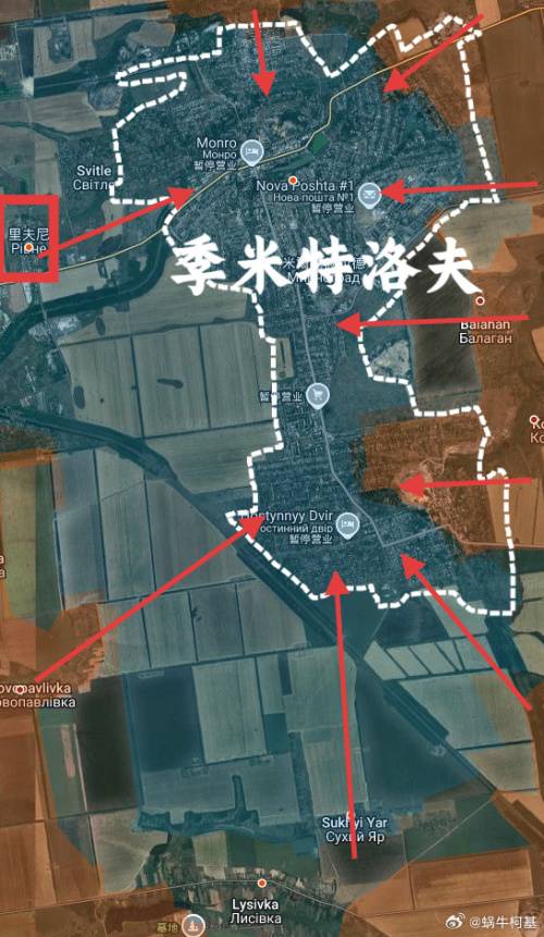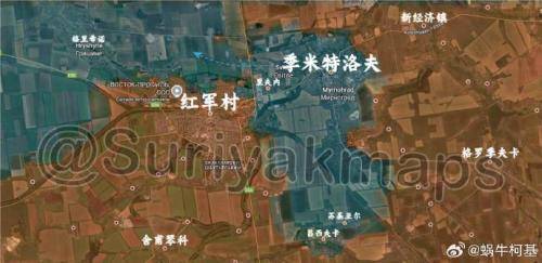 “俄军控制了红军村第八区的大部分,并进入了西北部的谢尔巴科娃区。同时,在东北部,卡拉科夫斯基区的大部分地区以及迪纳斯区的部分高层建筑(直至伊万娜·马泽皮街尽头)也被俄军占领。俄军突击队继续向西推进,渗透到里夫内的饲料厂;侦察队则继续向北推进,经过迪纳斯公墓,抵达了软饮料厂,同时还有一支侦察队从罗晋西克以南推进至养猪场区域。因此,乌克兰军队从季米特洛夫撤退的路线相当复杂,中间有一段不到一公里宽的狭窄通道,难以脱身。而且战斗仍在城南继续,俄军正缓慢向赫利博基大街推进。”