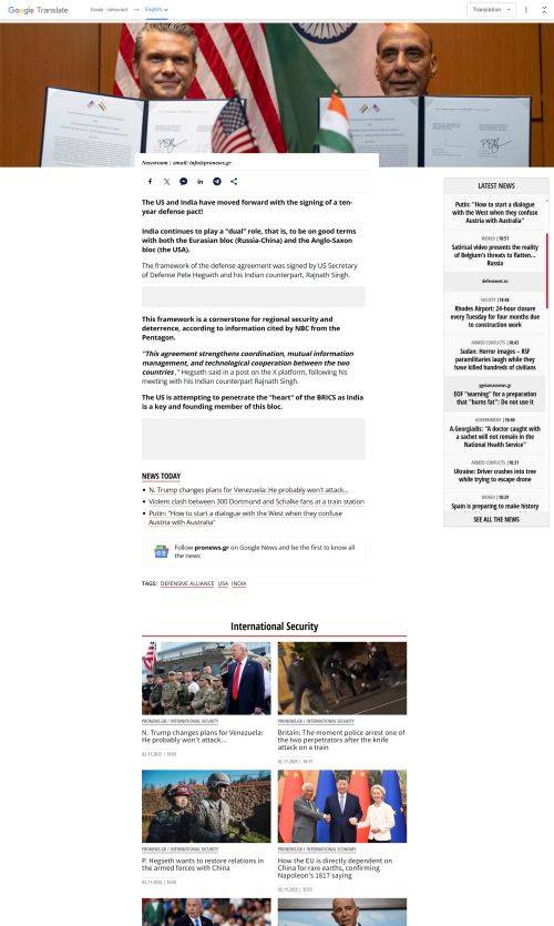 美国《新闻周刊》网站10月31日报道,美国与印度正式确定一项具有里程碑意义的十年期防务框架协议,希望能够显著深化军事合作。这标志着两国战略关系更进一步。这项协议是在美国国防部长皮特·赫格塞思与印度国防部长拉杰纳特·辛格于吉隆坡举行会谈后公布的。