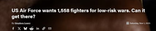 话题扯回来。既然CCA未来真面目并非现在这种不成熟的技术验证机,但为何《亚洲时报》依然对其前景不看好呢?报道分析称,美国空军的目标是在采购至少1000架CCA无人机,作为其下一代空中优势战略的一部分。CCA项目被五角大楼视为弥补当前美国空军严重的战斗机短缺问题的关键。